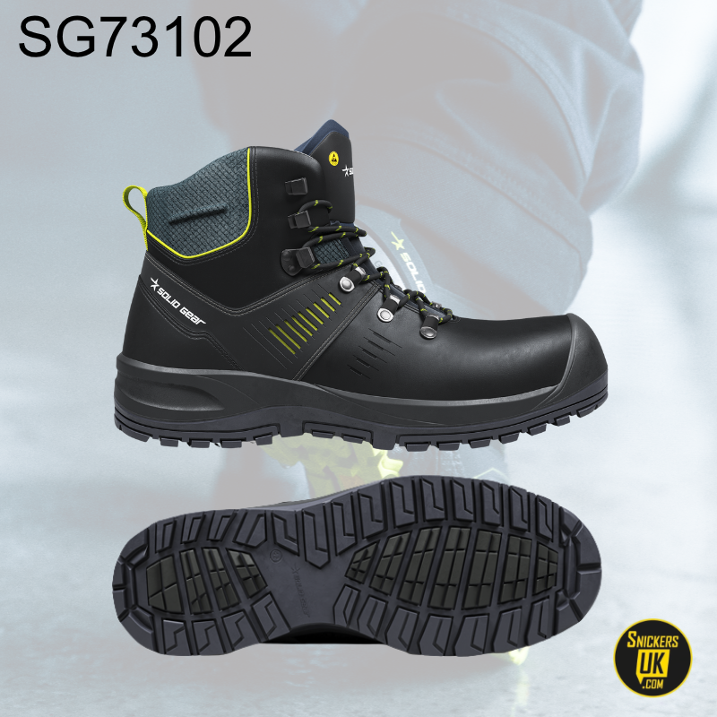 Modern midcut safety boot with built-in comfort in all parts. Upper of LWG leather with genuine finish and Polyester for durability. Moisture transporting and recycled lining for foot climate. Cushioning and breathable open cell PU foam insole. Stable PU midsole with integrated nylon shank. Oil and slip and heat resistant rubber outsole designed for great durability and traction. Fiberglass toe cap and soft nail protection. ESD function according to EN IEC 61340-5-1:2016.